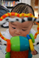 Gideon loves the ABC song. He always brighten up when we sing it to him. Other songs that make him smile: Good Morning Lord Jesus (we sing this every morning), Zippidy Doo Dah, Rubber Ducky (during bath time), Doe a Deer, and other random songs we just happen to remember on the spot. One thing's for sure...we need to learn more songs!